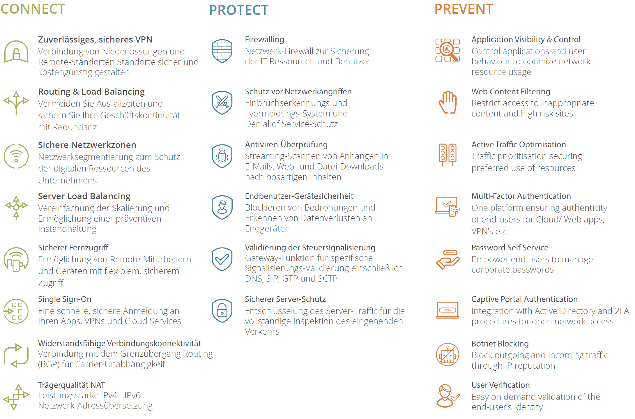 Mit den Produkten und Lösungen von Clavister setzen Sie einige oder viele Anwendungsfälle in den Bereichen Connect, Protect und Prevent ein. Vernetzung von Unternehmensstandorten untereinander und mit dem Internet, mit Fokus auf Sicherheit und Zuverlässigkeit. Überprüfen Sie den Verkehr (Traffic?) und das Verhalten des Verkehrs auf Bedrohungen, um Ihre digitalen Assets zu schützen. Und die Aktivierung präventiver Sicherheitsmaßnahmen und -regeln, die das Risiko von Fehlern der Benutzer bei der Bedrohung oder Gefährdung des digitalen Perimeters Ihres Unternehmens verringern können.